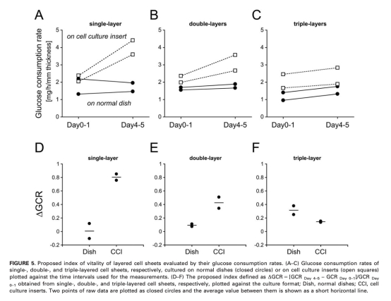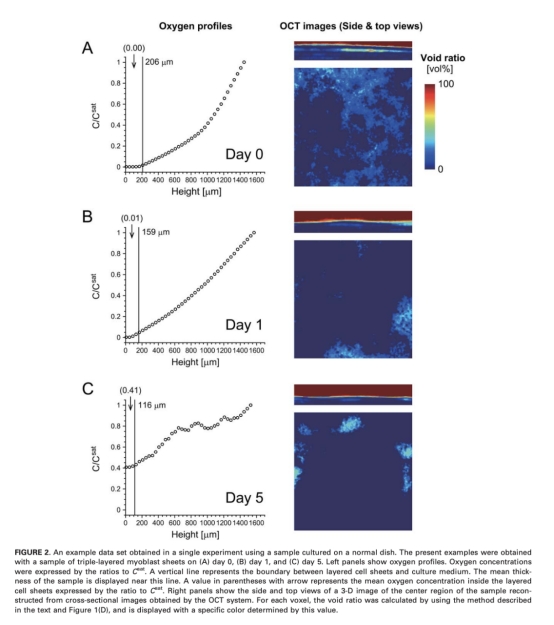 研究思路是使用層疊的成肌細胞片作為三維工程組織模型,通過溫度響應培養皿制備單層、雙層和三層細胞片。研究結合了氧微電極系統(使用丹麥Unisense電極)測量垂直軸上的氧濃度剖面,以及OCT系統獲取組織橫截面圖像以估計厚度。測量在培養的第0天、第1天和第5天進行,參數包括 pericellular oxygen concentrations (POC)、培養基氧梯度 (gradOxy_medium) 和組織氧梯度 (gradOxy_tissue)。同時,通過生化分析測量葡萄糖消耗率和乳酸產生率,并利用圖像處理分析空腔比率。研究還比較了在正常培養皿和多孔膜培養插入物上的培養效果,以評估不同培養條件對組織活性的影響。