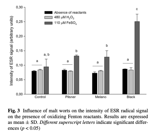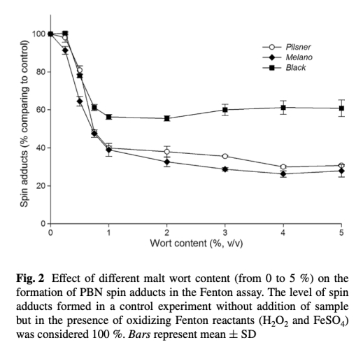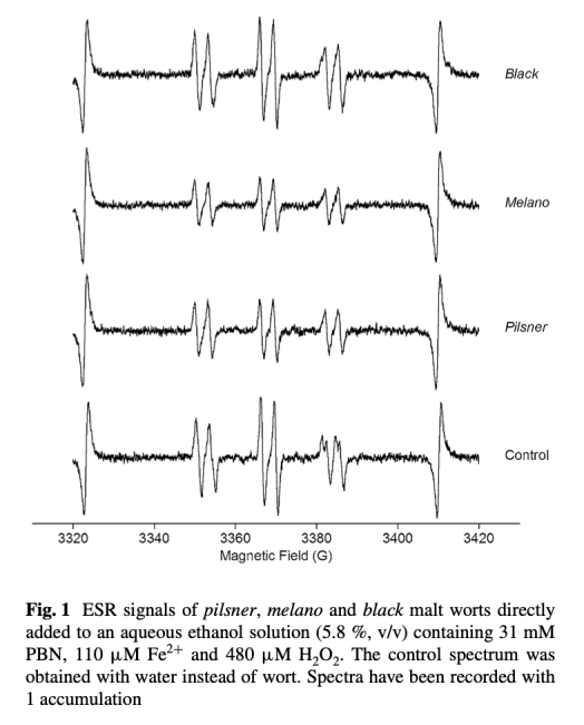 1 ESR自由基信號(hào)數(shù)據(jù):來(lái)自圖1,顯示了pilsner、melano和black麥芽麥汁在Fenton反應(yīng)中對(duì)PBN自旋加合物信號(hào)的影響。研究意義是直觀展示了不同麥芽對(duì)自由基的清除能力差異,黑麥芽信號(hào)較強(qiáng)表明其抗氧化能力較弱,為后續(xù)定量分析提供基礎(chǔ)。
