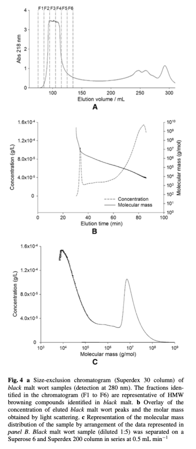 4 高分子量化合物分離和分子量數(shù)據(jù):來(lái)自圖4,通過(guò)SEC和光散射顯示了黑麥芽麥汁中高分子量化合物的色譜圖和分子量分布(范圍4×10^6至10^9 g mol^-1)。研究意義是直接證明了烘焙過(guò)程中形成的高分子量褐變化合物(如類(lèi)黑精)的存在,為其促氧化活性提供結(jié)構(gòu)依據(jù)。