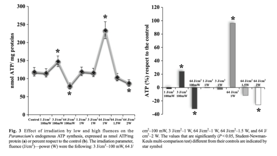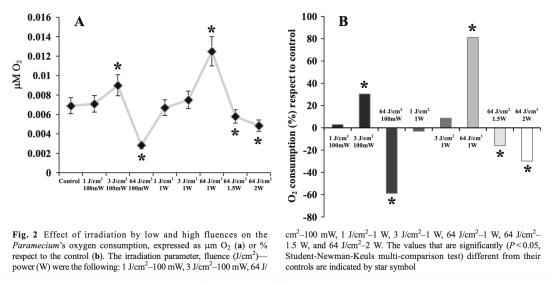 1 808納米、64 J/cm2-1 W激光療法比3 J/cm2-100 mW更能高效增強(qiáng)草履蟲(chóng)線(xiàn)粒體呼吸鏈活動(dòng),且效果不受約3°C溫度變化影響。