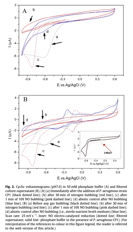 3 測量的可溶性電子穿梭體活性數(shù)據(jù):通過CV檢測細(xì)菌培養(yǎng)上清液,在約-140 mV處觀察到一個(gè)氧化還原峰,這與已知的銅綠假單胞菌分泌的電子穿梭體(如綠膿菌素)相符。該峰在注入NO后增大,表明這些可溶性物質(zhì)參與了NO還原的電子傳遞。該數(shù)據(jù)來自圖2B的CV曲線,特別是線條c。