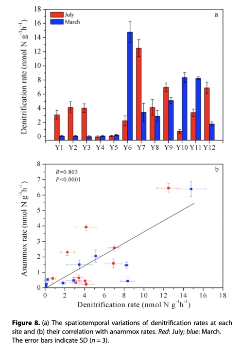 4. 反硝化速率數據:來自同位素示蹤,數據體現在圖8。研究意義是比較anammox與反硝化的關系,顯示兩者活性正相關,支持anammox和反硝化可能耦合的假設。