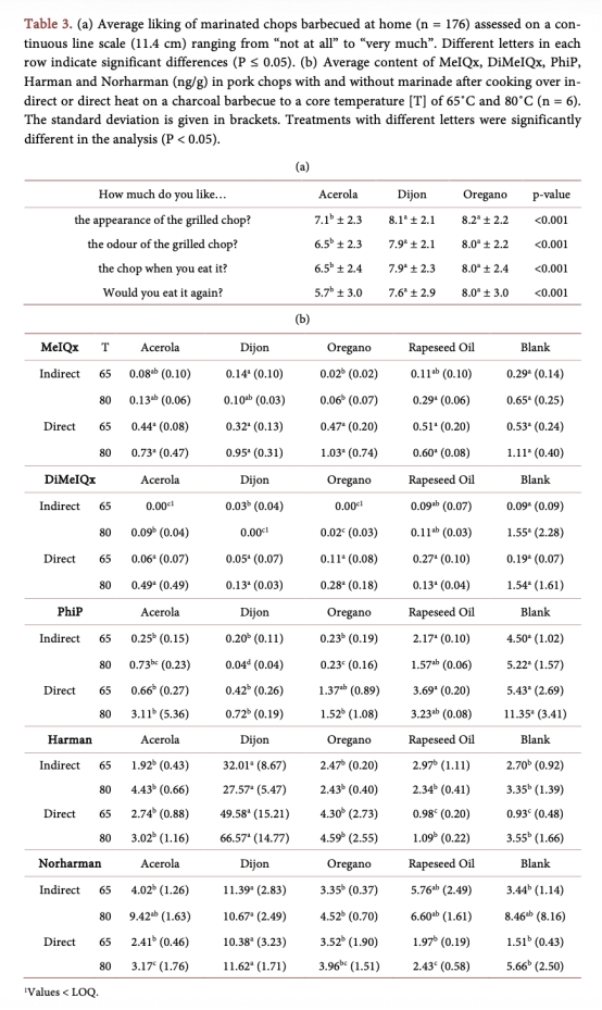 2 消費者喜好數據:來自表3a,通過家庭使用測試測量消費者對腌料豬排的外觀、氣味、口感和再購意愿的評分。研究意義是顯示牛至和第戎腌料更受歡迎,而針葉櫻桃腌料評分較低,強調腌料感官品質與實際應用的相關性,指導產品開發需平衡健康效益與可接受性。