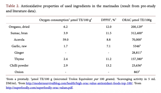 4 腌料成分和抗氧化性數據:來自表1和表2,列出腌料配方及成分的抗氧化指標(氧消耗、DPPH清除率)。研究意義是證實天然成分(如牛至的高ORAC值)貢獻抗氧化活性,但復雜配方可能干擾測量,提示需優化評估方法以確保實際效果。