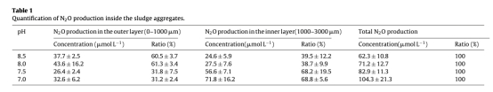 3 測量了N2O在污泥聚集體內(nèi)外層的產(chǎn)生量量化。數(shù)據(jù)來自表1,顯示在pH 8.0和8.5時(shí),N2O主要產(chǎn)生于外層(占比約60%),而在pH 7.0和7.5時(shí),內(nèi)層產(chǎn)生占比增至約68%。研究意義在于證實(shí)pH變化會(huì)改變N2O產(chǎn)生的主導(dǎo)途徑,低pH促進(jìn)反硝化途徑的N2O積累,強(qiáng)調(diào)pH控制對(duì)途徑調(diào)控的重要性。