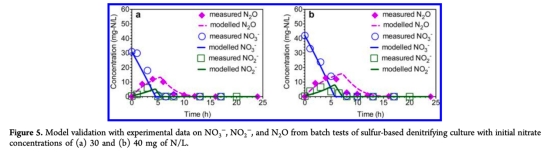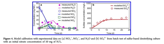 3. 數(shù)據(jù)來自圖4和圖5:測量了硫基AD過程中的硝酸鹽(NO3-)、亞硝酸鹽(NO2-)、氧化亞氮(N2O)和硫酸鹽(SO42-)的動態(tài)變化,用于模型校準(zhǔn)和驗證。研究意義是證實模型適用于硫基AD系統(tǒng),揭示N2O積累模式,并支持模型在不同條件下的適用性。