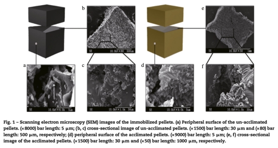 1 微生物形態數據:來自圖1的SEM圖像,顯示馴化后顆粒表面形成80-120μm厚生物膜,布滿桿狀細菌,而未馴化顆粒表面微生物稀少。研究意義是直觀證實固定化顆粒表面成功富集活性微生物,為高效硝化提供結構基礎。