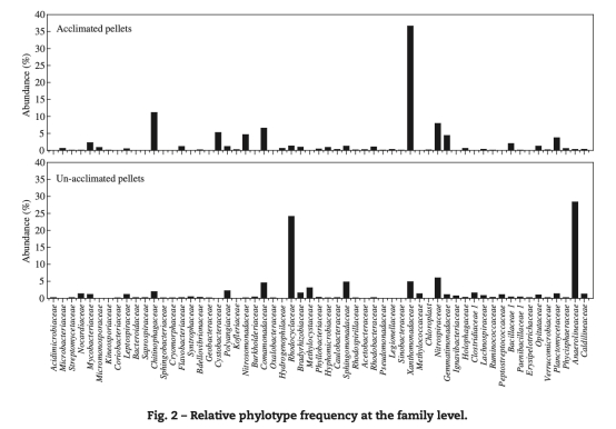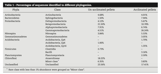 2 微生物群落數據:來自表1和圖2的高通量測序結果,顯示馴化后顆粒中變形菌門(Proteobacteria)占比從38.04%升至49.43%,γ-變形菌綱(Gammaproteobacteria)從4.51%升至26.24%,Rudaea spp.占23.44%。研究意義是揭示低溫硝化關鍵菌群(如硝化相關菌)的富集,解釋顆粒性能增強的微生物機制。