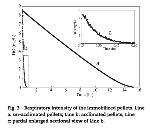 3 氧氣攝取率(OUR)數據:來自圖3和5,顯示顆粒OUR從初始4.11-26.62 mg O2/(L·hr)升至240.83±15.59 mg O2/(L·hr),且與NH4-N去除效率顯著正相關(R2=0.976)。研究意義是量化微生物代謝活性,證明氧氣消耗主要源于硝化過程,OUR可作為硝化效能的指標。