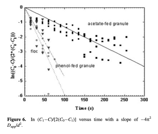5 測量了表觀氧擴散系數與顆粒尺寸的關系。數據來自圖7,顯示乙酸酯喂養顆粒Dapp與d成正比,苯酚喂養顆粒Dapp與d2成正比。