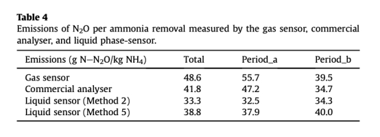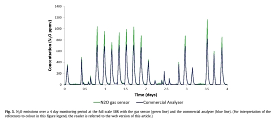3 數(shù)據(jù)來自圖3和表2:測(cè)量了全規(guī)模SBR在4天監(jiān)測(cè)期內(nèi)氣相N2O排放動(dòng)態(tài),比較氣體傳感器和商業(yè)分析儀的結(jié)果。總排放量氣體傳感器為19.69 kg N-N2O,商業(yè)分析儀為16.91 kg N-N2O,差異14.1%。研究意義是傳感器在高濃度峰值(>500 ppmv)時(shí)更準(zhǔn)確,商業(yè)分析儀飽和導(dǎo)致低估,突出傳感器在捕捉峰值排放方面的優(yōu)勢(shì),對(duì)準(zhǔn)確評(píng)估溫室氣體排放因子至關(guān)重要。