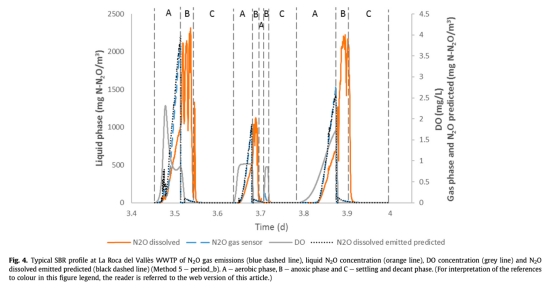 4 數(shù)據(jù)來自表3和圖4:測(cè)量了基于溶解N2O傳感器數(shù)據(jù)使用五種方法估算的排放量,與方法5(結(jié)合OTR和動(dòng)態(tài)KLa估算)的預(yù)測(cè)值與氣體傳感器測(cè)量值吻合度達(dá)98.7%。研究意義是驗(yàn)證了溶解N2O測(cè)量可可靠估算氣體排放,簡(jiǎn)化監(jiān)測(cè)設(shè)置;好氧階段貢獻(xiàn)總排放的96.1%,強(qiáng)調(diào)好氧過程的主導(dǎo)作用。