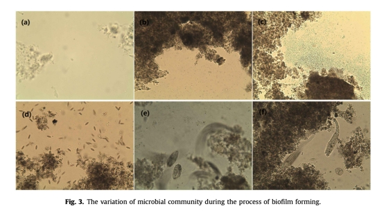 4 測量了生物膜形成過程中的微生物群落變化。數據來自圖3,通過光學顯微鏡觀察微生物多樣性。研究意義在于跟蹤生物膜成熟過程,顯示原生動物和后生動物的出現表明生態系統形成,增強了污染物去除的穩定性。