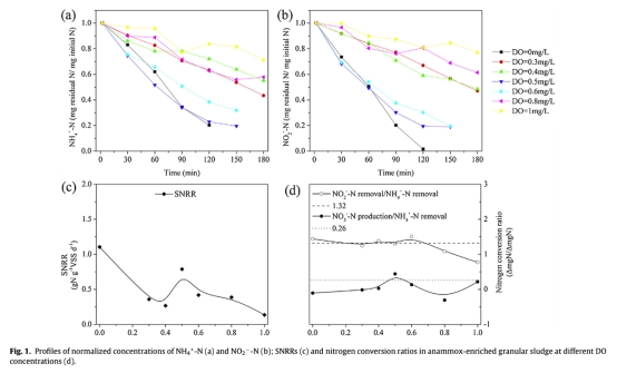 1. 數據來自圖1:測量了不同DO濃度下NH4?-N和NO2?-N的歸一化濃度剖面、SNRRs和氮轉化比。研究意義是顯示DO對氮去除的抑制效應,但DO為0.5 mg O? L?1時SNRR增加,表明除厭氧氨氧化外,硝化和內源反硝化等途徑也貢獻氮去除,幫助優化DO控制以平衡多種微生物過程。