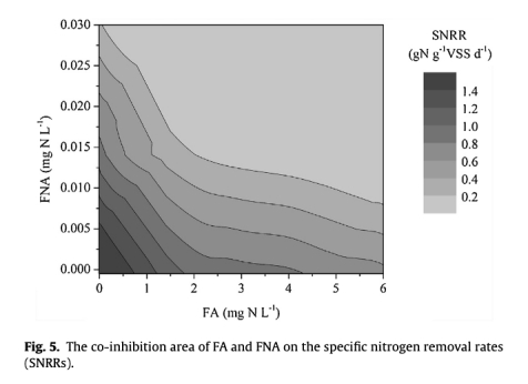 5. 數據來自圖5:通過等高線圖顯示了FA和FNA對SNRR的共抑制區域。研究意義是可視化pH依賴性抑制,表明FNA比FA更具抑制性,幫助設定pH控制區間以維持高效脫氮。