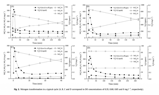 2 數(shù)據(jù)來自圖2:測量了典型周期中不同DO濃度下的氮轉化(NH4?、NO2?、NO3?和N2O濃度變化)。研究意義是揭示部分亞硝化過程的穩(wěn)定性,并顯示N2O排放的動態(tài)模式,如初始峰值 due to stripping of accumulated N2O。