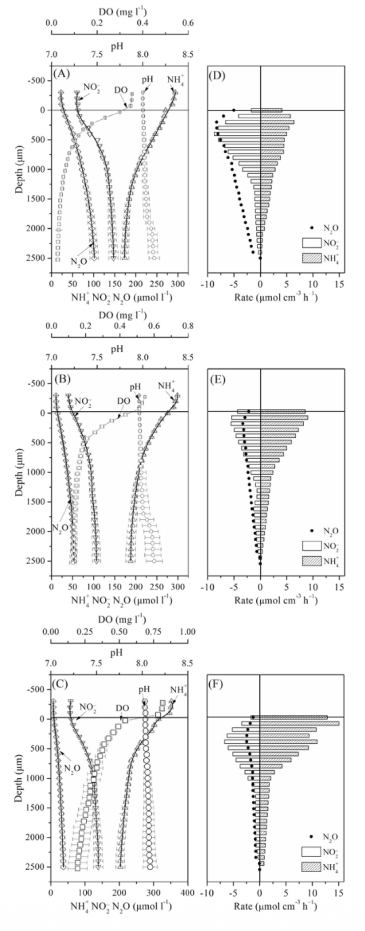 4 數(shù)據(jù)來自圖5:使用微電極測量了污泥聚集體內部的DO、pH、NH4?、NO2?和N2O的微剖面及凈體積速率。研究意義是直接可視化微觀環(huán)境,顯示外層(<1000μm)為高活性硝化區(qū),內層(1000-2500μm)在低DO下形成缺氧區(qū),增強反硝化途徑的N2O生產。