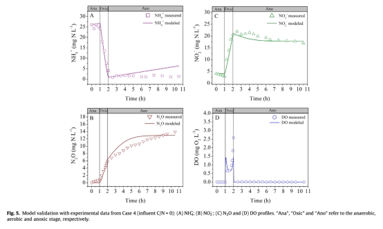 研究意義在于這些數(shù)據(jù)用于校準(zhǔn)和驗(yàn)證數(shù)學(xué)模型,確保模型能準(zhǔn)確捕捉AOA過程中氮轉(zhuǎn)化和N2O產(chǎn)生的動態(tài)。通過比較模擬與實(shí)測數(shù)據(jù),可以驗(yàn)證模型結(jié)構(gòu)合理性,并深入分析N2O產(chǎn)生途徑的貢獻(xiàn),如識別AOB反硝化為主導(dǎo)機(jī)制。數(shù)據(jù)來自不同C/N比案例,有助于理解操作條件對N2O積累的影響,為優(yōu)化工藝減少溫室氣體排放提供依據(jù)。