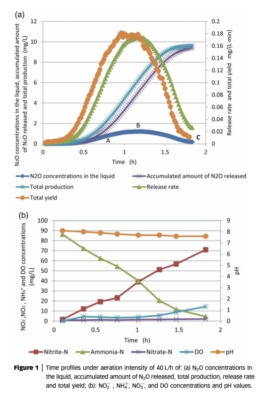1 測量了溶解N2O濃度、N2O釋放率、總N2O產量、NH4-N、NO2-N、NO3-N、DO和pH等參數。數據來自圖1、圖2、圖3、圖4和圖5。例如,圖1顯示了曝氣強度40 L/h下N2O濃度、累積釋放量、總產量、釋放率和總產率的時間曲線,以及相應氮化合物和DO的變化。