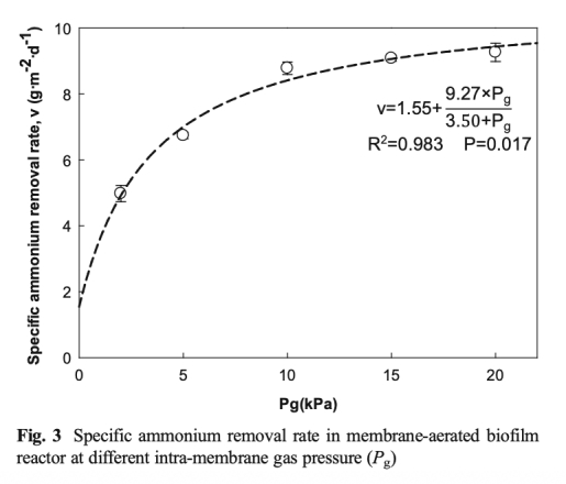 1 測(cè)量了特定銨去除率(v)隨Pg(2-20 kPa)的變化。數(shù)據(jù)來自圖3。研究意義在于顯示銨去除率在Pg低于10 kPa時(shí)顯著增加,超過10 kPa后改善有限,表明存在最佳Pg閾值,為優(yōu)化MABR能耗和效率提供依據(jù)。