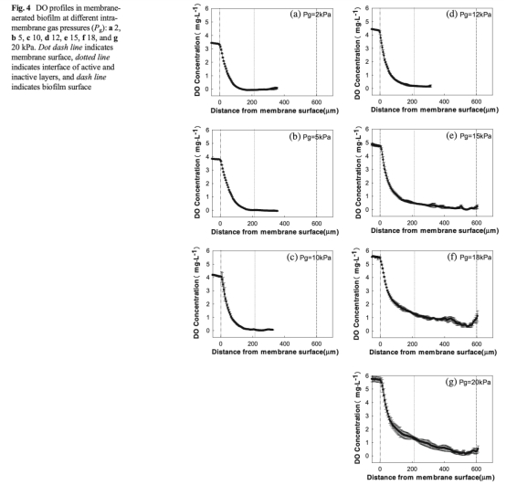 2 測(cè)量了生物膜內(nèi)溶解氧(DO)剖面,即DO濃度隨深度的變化。數(shù)據(jù)來自圖4。研究意義在于揭示氧在生物膜中的分布規(guī)律,區(qū)分活性層(近膜表面,氧快速消耗)和非活性層(遠(yuǎn)離膜表面,氧擴(kuò)散為主),幫助理解傳質(zhì)和反應(yīng)耦合過程。