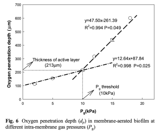 3 測(cè)量了氧滲透深度(dp)與Pg的關(guān)系。數(shù)據(jù)來自圖6。研究意義在于發(fā)現(xiàn)dp隨Pg增加而增加,但斜率變化點(diǎn)對(duì)應(yīng)活性層厚度(213 μm),可用于確定最佳Pg,避免過度曝氣。