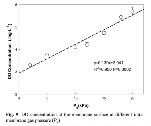 4 測(cè)量了膜表面DO濃度(SO2,m)與Pg的關(guān)系。數(shù)據(jù)來自圖9。研究意義在于證實(shí)Pg增加導(dǎo)致膜表面DO升高,但銨去除率不線性增加,強(qiáng)調(diào)氧傳遞與微生物活性的平衡重要性。