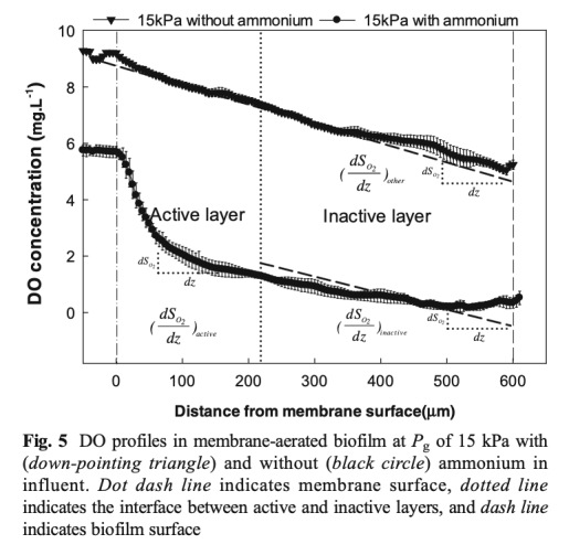 本研究調(diào)查了跨膜氣體壓力(Pg)對(duì)膜曝氣生物膜反應(yīng)器(MABR)中銨去除率的影響。實(shí)驗(yàn)結(jié)果表明,當(dāng)Pg從2 kPa增加到20 kPa時(shí),特定銨去除率從4.98 gN m?2 day?1增加到9.26 gN m?2 day?1,但改進(jìn)并非線性,存在一個(gè)閾值(Pg=10 kPa),超過該閾值后銨去除率改善不顯著。通過氧剖面分析,發(fā)現(xiàn)生物膜由銨氧化活性層和非活性層組成,氧滲透深度(dp)隨Pg增加而增加,但dp與Pg的比值在活性層和非活性層不同,從而可確定活性層厚度和最佳Pg。