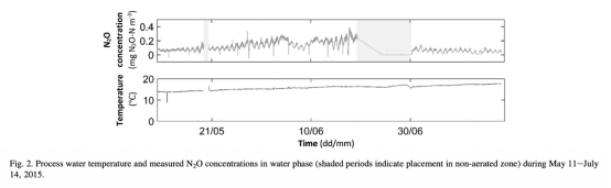 2 測量了水相中的溶解N2O濃度和工藝水溫,數據來自圖2,包括在曝氣和非曝氣區的測量,非曝氣區濃度接近零。