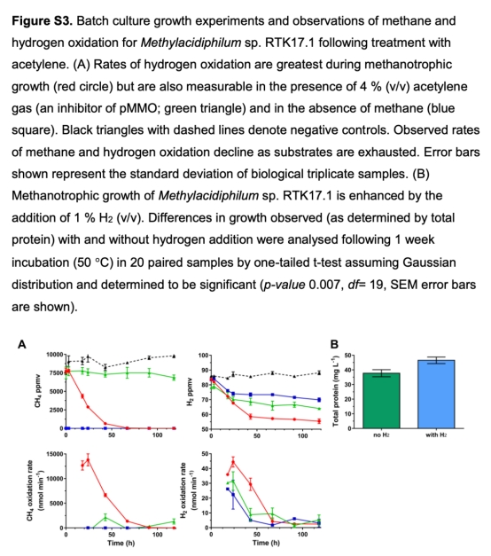 2. 氫氣氧化速率數據:使用丹麥Unisense氫微傳感器測量全細胞氫氣氧化速率,顯示速率與細胞密度成正比,并可低至55 ppmv濃度。數據來自圖2a和圖S3。研究意義在于首次證實疣微菌門甲烷氧化細菌具有氫氣氧化能力,并驗證其高親和力。