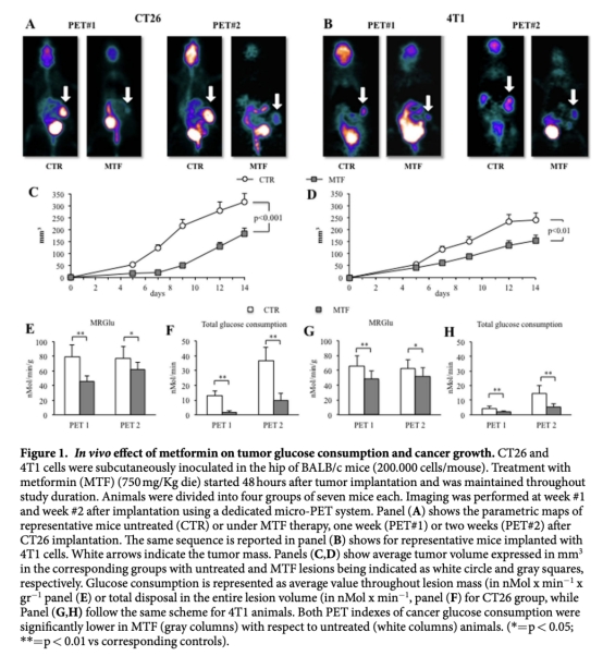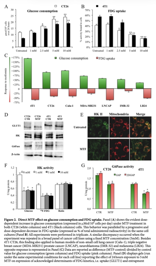 1 FDG攝取和葡萄糖消耗數據:來自圖1和圖2。研究顯示二甲雙胍處理導致FDG攝取減少而葡萄糖消耗增加。這一矛盾現象的意義在于挑戰了FDG-PET作為葡萄糖消耗指標的傳統觀點,提示存在新的代謝途徑。