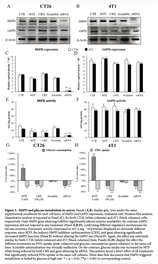 2 H6PD酶活性和表達數據:來自圖3。研究表明H6PD而非G6PD參與該新途徑,其抑制會降低葡萄糖消耗和FDG攝取。意義在于確定了內質網中的H6PD是新型葡萄糖代謝的關鍵酶。