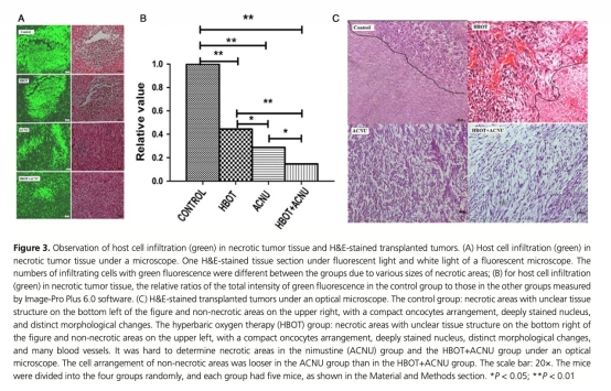 2. 腫瘤組織病理和炎癥細胞浸潤:數(shù)據(jù)來自圖3,通過H&E染色和熒光顯微鏡觀察,研究意義是分析壞死區(qū)域和宿主炎癥細胞浸潤程度。HBOT和ACNU處理減少了壞死和炎癥細胞浸潤,意義在于說明治療能改善腫瘤微環(huán)境。