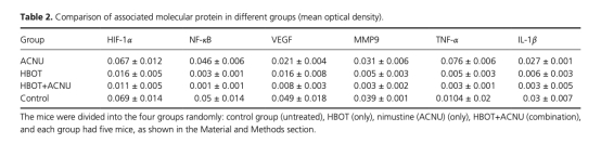 3. 分子表達水平(HIF-1α、TNF-α、IL-1β、VEGF、MMP9和NF-kB):數(shù)據(jù)來自表2和圖4,通過免疫組化和Western blot測量,研究意義是探討分子機制。這些因子在HBOT組和聯(lián)合組中表達降低,意義在于表明HBOT通過調(diào)節(jié)缺氧和炎癥相關(guān)通路來抑制腫瘤。
