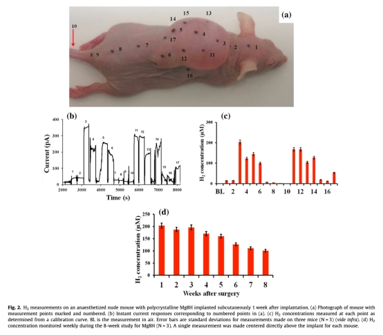 5. 背景氫氣水平的測量:數據在圖2c、圖3c中顯示(如尾部、頭部測量點)。研究意義是確認了小鼠體內源自消化過程的背景氫氣濃度很低(約1-7.3μM),遠低于植入物降解產生的信號,證明了測量的特異性。