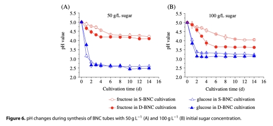 5 pH變化:數據來自圖6,顯示培養過程中pH下降。研究意義在于揭示代謝副產物酸的影響,葡萄糖導致pH更低,約束BNC合成,而果糖條件更溫和。
