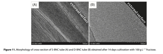 10 形態特征:數據來自圖11、12和表1,顯示橫截面和纖維網絡。研究意義在于揭示結構差異,S-BNC管呈層狀,D-BNC管均勻多孔,影響機械性能和生物相容性。