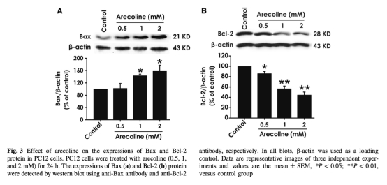 3 Bax和Bcl-2蛋白表達測量(圖3):檳榔堿上調Bax(促凋亡蛋白)表達、下調Bcl-2(抗凋亡蛋白)表達。研究意義:表明檳榔堿可能通過線粒體凋亡通路介導神經毒性。