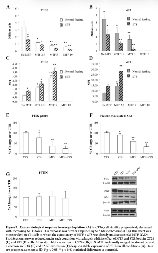 論文摘要指出,結(jié)合二甲雙胍(MTF)和短期饑餓(STS)能顯著損害結(jié)腸癌(CT26)和乳腺癌(4T1)的代謝和生長(zhǎng)。饑餓引起的糖酵解通量損害被二甲雙胍通過(guò)干擾己糖激酶II活性所增強(qiáng)。聯(lián)合治療附加性損害氧化磷酸化:二甲雙胍?guī)缀鯊U除復(fù)合物I功能;饑餓導(dǎo)致OXPHOS解偶聯(lián),并放大呼吸復(fù)合物II和IV的活性,從而結(jié)合大量ATP耗竭與活性氧顯著增加。更重要的是,聯(lián)合治療在實(shí)驗(yàn)?zāi)P椭猩羁虛p害癌癥葡萄糖代謝,幾乎廢除病變生長(zhǎng)。結(jié)果強(qiáng)烈表明能量代謝是減少癌癥進(jìn)展的有希望靶點(diǎn)。