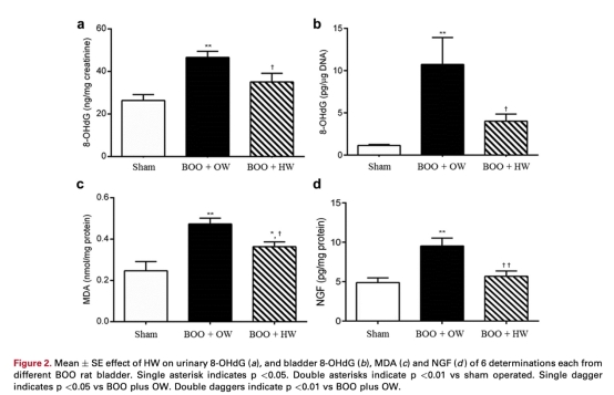 2 氫水降低氧化應激標記物(8-OHdG和MDA)和NGF水平,但不影響膀胱肥大結構變化。