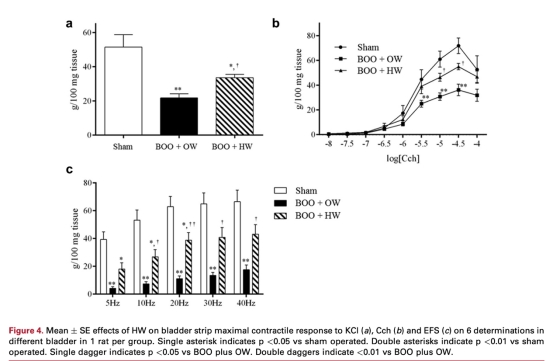 6 器官浴實驗數據(來自Figure 4):BOO加普通水組逼尿肌條對KCl、carbachol和電場刺激的收縮反應降低,氫水組顯著逆轉。研究意義:氫水改善逼尿肌收縮功能,證實其從分子到器官水平的多層次保護作用。