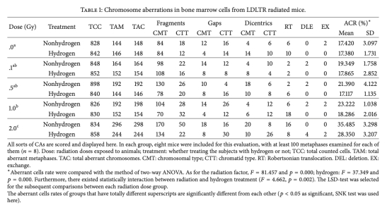 3 染色體畸變:分析骨髓細(xì)胞染色體異常類型和頻率,研究意義是直接評(píng)估基因毒性損傷,H2能降低輻射誘導(dǎo)的畸變率,表明其抗氧化和DNA保護(hù)作用。數(shù)據(jù)來自圖5和表1。