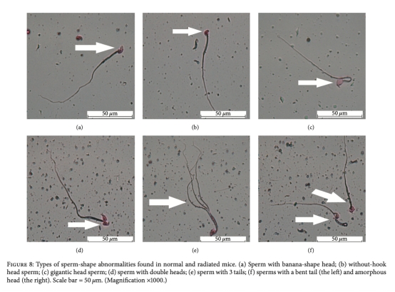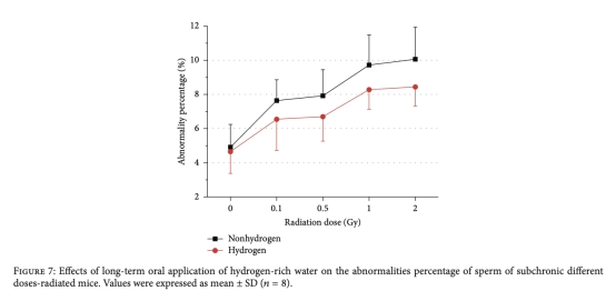 5 精子異常:評(píng)估精子形態(tài)異常百分比和類型,研究意義是檢測生殖系統(tǒng)損傷,輻射增加精子異常,H2能減輕這種損害。數(shù)據(jù)來自圖7和圖8。