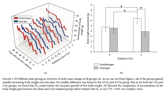 1 體重變化:測量小鼠體重隨時(shí)間的變化,研究意義是評(píng)估整體健康狀況和應(yīng)激反應(yīng),體重異常增加可能反映輻射誘導(dǎo)的代謝紊亂,H2處理能正常化體重增長。數(shù)據(jù)來自圖1。