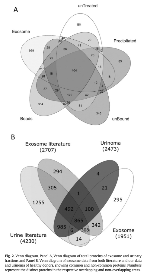 2 測量了外泌體和urinoma的蛋白質組,通過質譜鑒定出3429種蛋白質,外泌體特有蛋白質959種(28%),urinoma特有1478種(43%),重疊僅992種(29%)(來自圖2)。研究意義是揭示外泌體蛋白質組的獨特性,表明其可能具有特異功能,如代謝途徑富集。