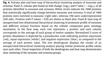 3 測量了蛋白質組的差異表達,通過主成分分析和熱圖顯示外泌體與urinoma形成獨立簇(來自圖3和圖4)。研究意義是證實外泌體蛋白質組與urinoma顯著不同,支持其作為獨立功能實體的觀點。
