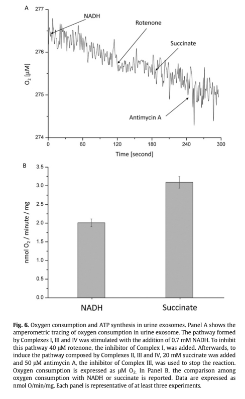 5 測量了外泌體的氧消耗和ATP合成,使用丹麥Unisense電極進行安培法檢測,結果顯示外泌體在添加NADH或琥珀酸后消耗氧氣,并被魚藤酮和抗霉素A抑制(來自圖6)。研究意義是直接證明外泌體具有功能性氧化磷酸化能力,P/O比約為2.4,表明氧氣消耗與ATP合成耦合。