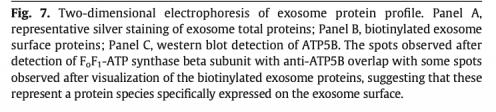 6 測量了外泌體表面蛋白質的表達,通過生物素標記和二維電泳,檢測到ATP合酶β亞基(ATP5B)位于表面(來自圖7)。研究意義是確認呼吸鏈蛋白在外泌體表面功能性表達,支持其自主進行有氧呼吸的機制。