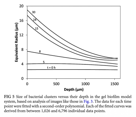 2 聚集體形態和大小梯度數據:共聚焦顯微鏡圖像顯示細菌形成密集聚集體,且大小隨深度增加而減小。研究意義:證實模型再現了體內生物膜的空間異質性,聚集體大小梯度反映了營養和氧的擴散限制。數據來自圖3和圖5。