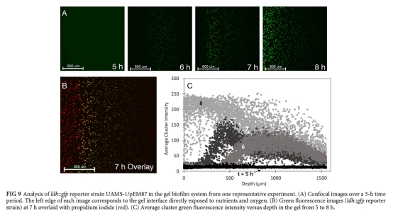 5 基因表達異質性數據:使用ldh::gfp報告基因監測乳酸脫氫酶表達,顯示在凝膠內部區域表達增強。研究意義:驗證了缺氧生理響應,基因表達模式與預測的氧梯度一致,體現了生物膜的生理異質性。數據來自圖8和圖9。